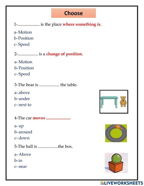 Web motion worksheets and online activities. Forces affect motion in predictable and mathematical ways. In this worksheet, kids practice describing position by relating each object to.