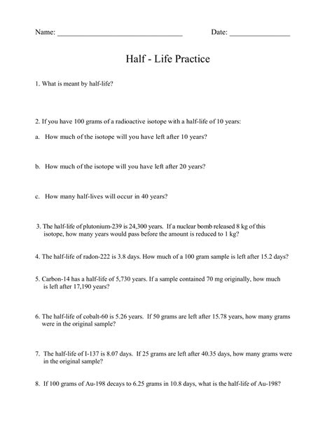 Some of the worksheets displayed are half life graph work name date class, name per life and radioactive. This radioactive decay worksheet is available in two formats: Observe the half‐life demonstration as directed by your teacher.