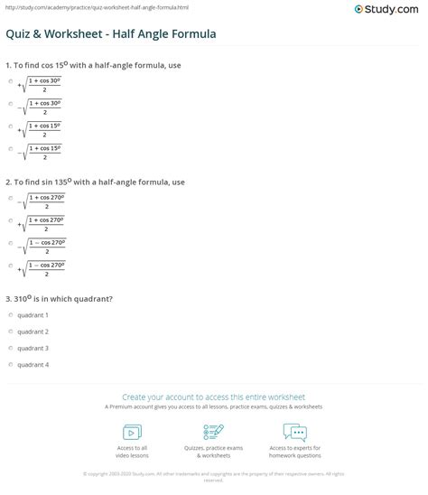 Half Angle Formula Worksheet. The double angle formulas are in terms of the double angles like 2θ, 2a, 2x, etc. Many of these processes need.